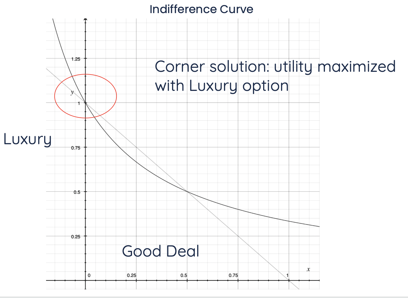 []* This is out of scope for this article, but typically, an indifference curve is solved for its interior solution. In our example, given you can only purchase one travel bundle, e.g. “Luxury”, “Good-Deal”, or “Shortest-Route”, and not a combination.